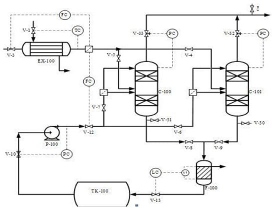A 409.7149 kg/h flare flue gas adsorption process according to Figure 1 was designed using a computer-aided design approach. Microsoft Visio 2013 was used for the process flow diagrams, and an Aspen HYSYS process simulator was used to perform the simulation. The adsorption column was configured to meet the proposed configuration and material and energy balance calculation. In addition, the equipment design calculation was performed using Aspen HYSY except for the filter unit design calculation, which was performed using the Mathcad application. The simulated adsorption process is as shown in Figure 2. The unique adsorption column designed specification was done to capture over 90% of CO2 and other GHG Figure 3.