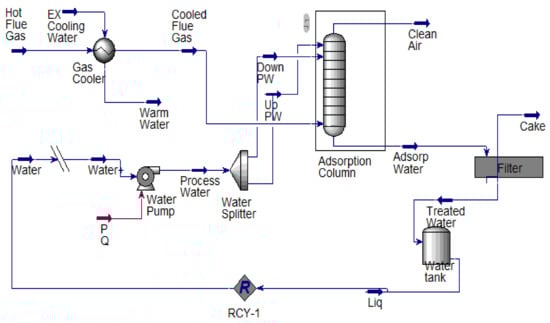 This study proposed and implemented a novel process concept based on the modification of the existing adsorption column with new adsorbents introduced (Bentonite and Akrosorb soda-lime) in the adsorption column. The modification made on the existing adsorption process is depicted in the flow diagram as shown in Figure 1. The proposed process concept has several advantages: simple modification to equipment and the possibility to separate CO2 and other GHG simultaneously. The diagram in Figure 1 indicates the process flow proposed and novel CO2 and GHG capture process technology. The flue gas from the flare stack at a maximum temperature of 280 °C is cooled to 20–30 °C in a heat exchanger EX-100 and then fed to the adsorption column C-100, A/B through a middle section feed stage. In addition, the process water from TK-100 is pumped using pump P-100 to the adsorption column C-100 and fed to the column through the top and middle section of the column. In the absorber column C-100, the flue gas is passed through two sections of adsorbent, Akrosorb soda-lime and Bentonite, where the flue gas comes into contact with the process water co-currently and passes through the Bentonite adsorbent bed at the bottom section of the column. The relatively clean gas from the Bentonite section flows up and counter-currently with the water through the Akrosorb soda-lime bed at the upper part of the column; then, the water effluent from the lower part of column C-100 along with free particles of the adsorbent washed off by the flowing water are passed through the filter, F-100, before storage in tank TK-100. The adsorbent type and structure for the adsorption column are listed in Table 1. The reason for the selection of this packing type and structure is because they are the best and are a relatively lower cost than a structured one. In addition, the efficiency is high, vapor capacity is high, and the low-pressure drop compared with the other structure as well as the typical turndown ratio is good.