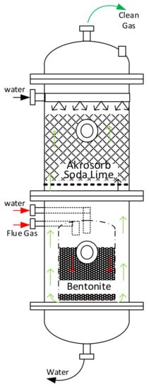 The modification made on the existing adsorption process is that the flue gas and water were fed concurrently at the middle of the packed bed adsorption column (no adsorption column has this; it is only happening in the stripping process). The gas and water get mixed before contacting the adsorbent (i.e., gas dissolves in water before contact with the absorbents) to keep the adsorbent moisturized, thereby enhancing the adsorption of CO2 and other GHGs. In this regard, the packed column can handle a large volume of gases beyond its design capacity effectively and efficiently at a low cost, which opposed the current theories that consider that a packed bed absorption column of only less than 0.6 m in diameter would accommodate. The relatively clean gases from the Bentonite adsorbent section flow downwards to a concentric section in the column and then flow upward through the concentric space to the Akrosorb soda-lime bed at the upper section with water flowing from the upper part of the column as well counter currently to also keep the Akrosorb adsorbent bed moisturized for enhanced gas adsorption. Then, the finally cleaned gas is discharged from the top of the column, and the excess water in the column flows out from the bottom of the column.