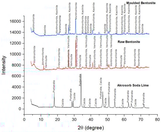 An XRD test was conducted on the raw Bentonite clay, molded Bentonite, and Akrosorb adsorbents powder samples. The Akrosorb soda-lime adsorbent was made into a fine powder before XRD weight. The scan was performed for the Akrosorb adsorbent. The XRD forms were generated from XPERT-PRO XRD through CuKα radiate (λ = 1.54 Å). The experiment was maintained at atmospheric temperature and power at 40 kV with 40 mA. The same procedure was repeated for raw Bentonite and molded Bentonite powder.