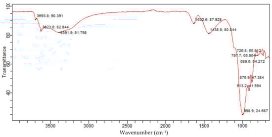 The crystallography of the molded Bentonite clay was also examined using XRD analysis as presented in Figure 7. The Figure 7 result shows the diffraction peaks of molded Bentonite at 2θ angles of 5.66°, 20.92°, 25.01°, 26.69°, 30.87°, 35.15°, 36.59°, 37.30°, and 44.87° are typical of those of Montmorillonite silicate phase and correspond to the diffraction peak of Montmorillonite in the raw Bentonite clay. The most intense peak is observed at the 2θ angle of 30.87°, which corresponds to those of Montmorillonite, showing that the molding of the Bentonite clay using Na2SiO3 binder did not affect the structure of the Montmorillonite silicate phase. However, it was observed that the XRD pattern of the vermiculite phase in the Bentonite clay changes after molding with Na2SiO3 binder to the kaolinite silicate phase. Figure 7 shows that the diffraction peaks of molded Bentonite at 2θ angles of 12.43°, 24.96°, 39.51°, 49.12°, and 70.10 are typical of the kaolinite silicate phase. The characteristic peaks of the kaolinite were for crystalline silica. It can be seen that the other peaks that represent the kaolinite phase were much lower; they generally had an intensity of fewer than 900 counts and even lower, which implies that the kaolinite content is lower than Montmorillonite content in the molded Bentonite. The change in the phases in the molded Bentonite clay indicates that the binder utilized affected the crystal structure of the Bentonite from vermiculite phase to kaolinite phase. It was further observed that the crystal system of the molded Bentonite clay is anorthic. The analysis further shows that the degree of crystallinity of the molded Bentonite clay reduces to about 9.98% with a 90.02% amorphous silica phase. The slight increase in the amorphous silica phase would further enhance the adsorptive properties of the molded Bentonite compared to the raw Bentonite.