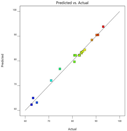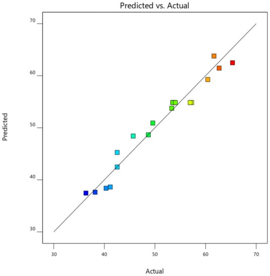 This was further demonstrated by the plot of predicted CO2, CO, NOx, and HC removal efficiency against the actual experimental CO2, CO, NOx, and HC removal efficiency values, as shown in Figure 17. From Figure 18, the data point was found to be very closer to the diagonal lines, which indicates the closeness of the model’s predicted result with that of the actual experimental results, which further demonstrates and validates the goodness of the fitted models.