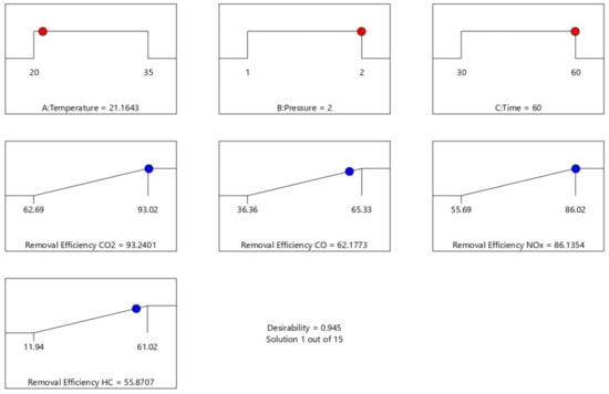 Table 5 shows the optimization result generated at different experimental design points. The optimum condition of the process parameter that maximizes CO2, CO, NOx, and HC removal efficiency are 21.164 °C, 2 atm, and 60 min to give 93.24%, 62.18%, 86.14%, and 55.87% for CO2, CO, NOx, and HC removal efficiency, respectively, at a desirability factor of 0.945 (a mathematical method to find the optimum). Additionally, a Ramp plot, which is a graphical view of each optimal solution, was used to depict the established optimum process parameters as well as the responses depict in Figure 19.
