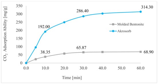 Figure 20 depicts the adsorption trend of CO2 gas in Akrosorb soda-lime and molded Bentonite ball adsorbents for 0–60 min and 35 °C temperature. A sharp rise in adsorption of CO2 was observed in the first 0–10 min to attain adsorption of 192.0 mg CO2/g and 38.35 mg CO2/g for Akrosorb soda-lime and molded Bentonite ball adsorbents, respectively. This could be attributed to the availability of a sufficient adsorption site per unit mass of adsorbent in the first 0–10 min of adsorption. In addition, for both Akrosorb soda-lime and molded Bentonite ball adsorbents, the rate of CO2 adsorption increases slightly from 192 to 286.40 mg/g and 38.35 to 65.87 mg/g respectively as time increases from 10 to 30 min. However, as the adsorption time increases beyond 30 min to 60 min, the curve for both Akrosorb soda-lime and molded Bentonite ball adsorbents tends to flatten, reaching maximum adsorption of 314.30 mg/g and 68.90 mg/g at 60 min. This is attributed to the fact that a further increase in time beyond 30 min resulted in the adsorption sites getting saturated gradually and the acceptance rate being regulated by the rate at which the CO2 gas is been moved from the exterior of the adsorbent to the internal part, and as such, the adsorption rate became much slower.