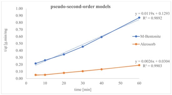 Concerning Equation (8) [,] a pseudo-2nd-order kinetic model is said to be applied if we plot t/qt against time (t), resulting in a square with an intercept of 1/qe and 1/h. The same mathematical procedure was utilized for the molded Bentonite adsorbent as shown in Figure 5.