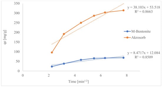 The adsorption kinetics of Akrosorb soda-lime and molded Bentonite ball adsorbents was evaluated using the IPD model in Equation (4). The model gives an insight into various kinds of adsorption process mechanisms. This process can be illustrated in three basic steps: superficial adsorption, IPD, and the very fast stage, the final equilibrium.