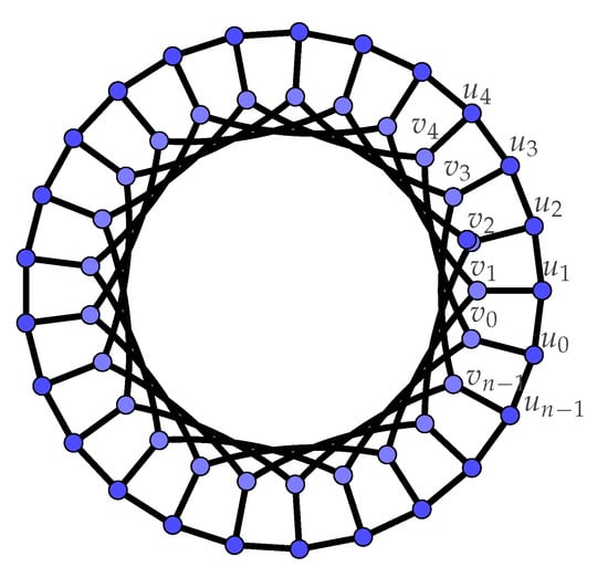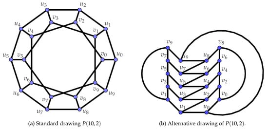 For and k, , the generalized Petersen graph , is a graph on vertices with and . This standard notation was introduced by Watkins [5] (see Figure 1).