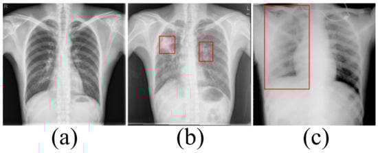 Medical image datasets contain fewer samples and often require data enhancement to increase the number and complexity of training samples. Data enhancement can make the training samples contain the type of test samples as much as possible, and improve the generalization ability of the network. We first perform a horizontal flip of the training sample and a rotation transformation between −20 degrees and 20 degrees with an interval of 5 degrees. These basic transformations can simulate the different postures of the person when doing the examination. The Montgomery dataset and Shenzhen Hospital (SH) dataset only include CXRs of healthy people and patients with moderate pneumonia. In order to simulate the presence of a large number of opacities in the lungs, we use block masking. We think of a large number of opacities in the lungs as missing data. As shown in Figure 2, the block masking simulates the opacities, increasing the complexity and diversity of the samples. If the width of the block masking is equal to the width of the image, the height of the block masking is half or one-third of the image’s height. If the height of the block masking is equal to the height of the image, the width of the block masking is half or one-third of the image’s width.