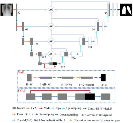 For U-Net, the convolutional layer of each layer can extract plenty of detailed information related to the task. However, opacities make the background and the target less distinguishable, and the convolutional layers are too few. As a result, U-Net cannot extract sufficient high-level semantic features, such as position and edge information. The segmentation results are not ideal. VAE can obtain high-level semantic information in the data by estimating the data distribution, such as the relative position of the lungs and surrounding organs. This high-level semantic information is beneficial for locating the contours of the lungs and performing accurate segmentation. However, the features extracted by VAE are not refined enough, and a great deal of detailed information is lost. In order to achieve the complementary advantages of the convolutional layer and VAE, we splice the features of the convolutional layer with the features of the VAE. We then use the convolutional layer with a convolution kernel of 3 × 3 to perform feature fusion and channel number shrinking. Through feature fusion, the convolutional layer and VAE can complement each other’s advantages. Therefore, FVAE can extract both detailed information and high-level semantic information, which improves the model’s ability to extract features.