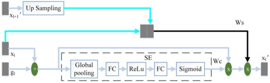 The output feature of the l-th layer of the encoder and the output feature of the corresponding layer of the decoder are added to perform feature fusion. Then this article uses the SE module to calculate the channel attention coefficient . The SE module [17] is composed of global pooling (GP), fully connected layer (FC), ReLu and Sigmoid. uses the same two convolutions as the decoder to obtain preliminary features, where the number of channels is 32. We then use a convolution with the number of channels of 1 and the convolution kernel of 3 × 3, and the sigmoid to obtain the spatial attention coefficient . from the output of the adjacent high-scale attention mechanism or the feature of the convolutional layer is up-sampling to obtain the same size as . obtains the spatial attention coefficient in the same way as . and are spliced by channel. We then use a convolution with a convolution kernel size of 3 × 3 and channel number of 1, and sigmoid to perform feature fusion and obtain the final spatial attention coefficient . Finally, the fusion feature of and is multiplied by and to obtain the final output .