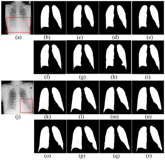 The segmentation results of patients in JRST dataset. (a,j) input images; (b,k) ground truth; (c,l) FCN; (d,m) SegNet; (e,n) U-Net; (f,o) AttU-Net; (g,p) LF_Seg; (h,q) VAEU-Net; (i,r) OUR.
