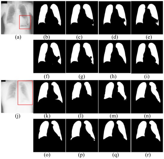 The segmentation results of healthy people in JRST dataset. (a,j) input images; (b,k) ground truth; (c,l) FCN; (d,m) SegNet; (e,n) U-Net; (f,o) AttU-Net; (g,p) LF_Seg; (h,q) VAEU-Net; (i,r) OUR