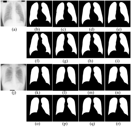 The segmentation results of CXRs for healthy people in the JRST dataset are shown in Figure 7. In the two original images, the boundary between the lung and the surrounding tissue is clearly visible and the contrast is high. The proposed algorithm and other algorithms can achieve good segmentation results. The results are very close to the ground truths. The above results shows that the proposed algorithm and the comparison algorithms can segment the lungs of healthy people very well.