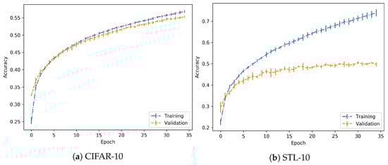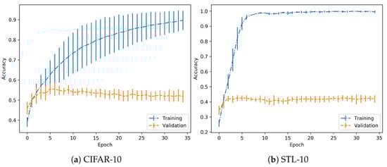 In comparison to Figure 3, there is a supposed improvement in the performance for both CIFAR-10 and STL-10, since stabilized values of training accuracy around 0.9 and 1.0 are obtained. However, this is induced by overfitting. The models exhibit good performance in the training set, and bad performance on the validation set. The accuracy on the latter tends to decay from the fifth epoch, which is a clue that the models are in an overfitting state. In comparison with the no-overfitting regime, the performance curves do not follow the same tendency in training and validation.