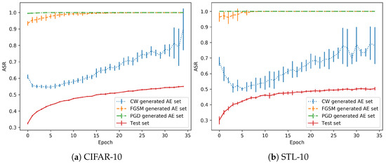 Again, PGD and FGSM adversarial examples consistently fool the model during the whole process. All the methods have greater ASR values for the epoch that was selected to generate the adversarial examples, as expected. This is observed as greater standard deviation in some specific initial epochs during the different runs. The CW method is discovered as the most informative method for the purpose of this work. For both datasets, the behaviour is similar. In contrast with the normal regime shown in Figure 4, the overfitting regime is able to stabilize the adversarial impact measured by the ASR around 50–60% and does not show an incremental rate on the adversarial performance, as the “normal” training did. This is a clear sight to support the benefit of an overfitting regime since the effect of adversarial examples was much more deep in the normal regime.