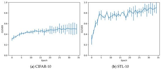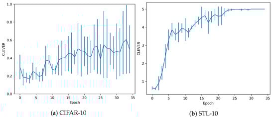For the CLEVER metric, Figure 9 shows the values for this robustness score. As it is observed, in the overfitting regime models are much stronger. In the case of CIFAR-10 dataset, values are similar than the ones shown in Figure 5, but a larger standard deviation points out that the values are greater in more cases. The greatest impact is observed in STL-10 dataset. In this case, CLEVER values are not in a range of 0.4–1.0 (as is the normal regime). They increase exponentially to from 1.0 to 5.0 in the last epochs. In consequence, the metric is supporting our proposal that this scenario is beneficial against adversarial examples.