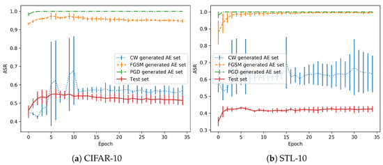 Table 3 shows the AE distances with respect to the original test set for STL-10. The PGD and FGSM AE sets consistently fool the model during the whole training process, as seen in the previous curve. This is produced because, as this table points out, the adversarials generated by these methods are farther away (from the original test samples) in comparison with the examples generated by CW. With distances ranging from 23–26, against 0.97 on average by CW, this means that the adversarials are too far. Instead, CW examples achieve good ASR with potentially undetectable adversarials. Considering the size of the images in this dataset (98 × 98 = 9604), more than the 90% of the pixels are modified in comparison with the original test images (see distances in Table 3). The maximum perturbation, calculated in distance, is 0.30 for FGSM-PGD (which is expected as it is bounded by a parameter of the adversarial methods), while CW has a smaller value, with 0.06. These results also point in the same direction as the previous statements, supporting the notion that the improvement in generalization also leads to worsening results for AEs that are closer to the originals. In other words, as the models achieve better generalization, robustness to the best AEs (which are very close to the original) decreases.