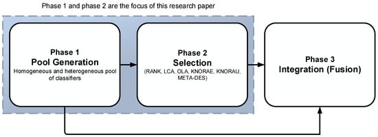 A Multiple Classifier System (MCS) comprises three phases: pool generation, selection, and integration, as shown in Figure 1. The pool generation phase 1 involves generating a pool of diverse and accurate classifiers. The pool diversity is achieved through either a homogeneous ensemble pool using either bagging, boosting or hybrid schemes or a heterogeneous ensemble pool of different base classifiers [9]. In the selection phase (phase 2), a single or a set of multiple classifiers from the pool is selected. In the final phase 3, the selected classifier (DCS) or classifiers (DES) predictions are integrated for the final decision. In certain scenarios, such as when the whole classifier pool in phase 1 is used, the selection phase becomes unnecessary. When just a single classifier is selected, the integration phase, this time around, becomes unnecessary. A static ensemble approach is usually used to integrate the final decision of the generated pool of classifiers [9]. This paper focuses on phase 1 and 2, on homogeneous and heterogeneous pool generation schemes and the DS strategies.