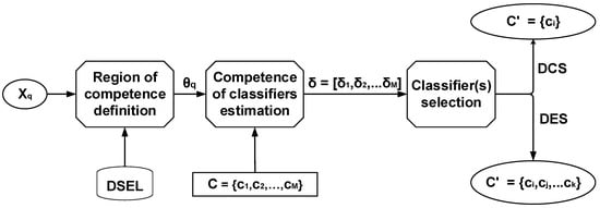 The six strategies are briefly described as obtained from [9,24]. Figure 2 depicts the three steps in the DS approach. The dynamic selection dataset (DSEL) is either the training or validation set, while is the query examples that are used to defines the region of competence (RoC) of query example. C is the pool of classifiers with M size, δ is the vector that estimates competences of each base classifier in C. is the final EoC, depending on the DS strategy of either one base classifier in DCS or more than one base classifiers in DEC schemes. The vector δ is used to define EoC that will be used to label query examples .