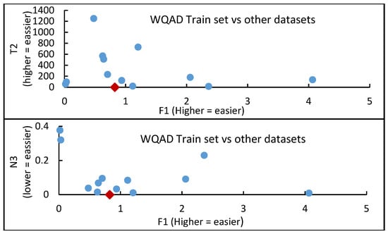- Maximum Fisher’s Discriminant Ratio (F1) is a measure that computes the overlap between feature values and the different classes, and it is defined in Equation (1) as:where, are the means, and are the variances of class1 (True) and class2 (False) in that feature dimension. A high F1 value indicates a weak overlap between classes and represents a lower complexity and easier classification problem. F1 is in the range of [≈0 to 1].