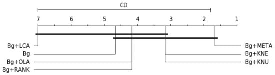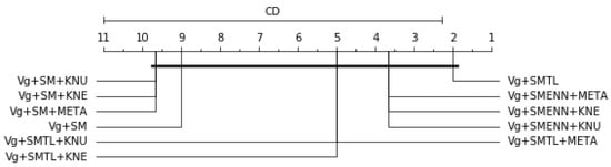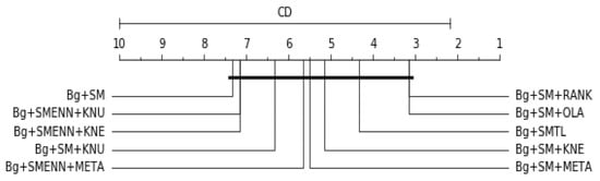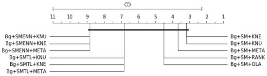 Table 16 is the overall average rank of 10 best models considering all three scores (balanced accuracy, F1 and G-mean), df = 10, α = 0.05, p-value = 1.6701e-05, Ftest = 22.0, CD = 8.7161. Bg+SM+KNE and Bg+SM+KNU are tied and the top-ranked models. The result is graphically represented in Figure 12. Since the p-value is lower than 0.05, it indicates strong evidence against the null hypothesis. Therefore, the null hypothesis is rejected for this result.
