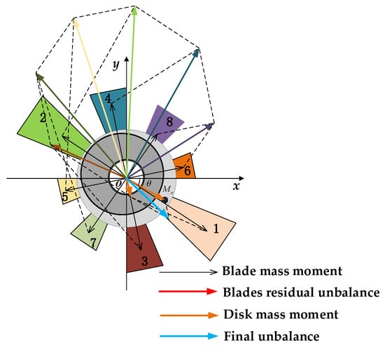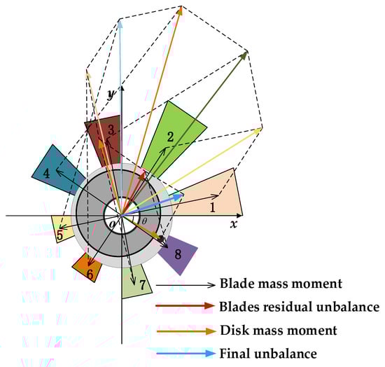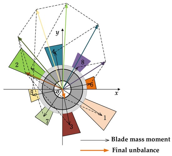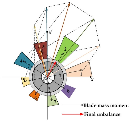 We define mi × ri as the mass moment vector, that is, the product of the blade mass and the distance from blade gravity center to the rotor axis. It can be seen from Equation (2) and Figure 2 that mass moment vectors of all the blades can be cancelled out and the minimum unbalance obtained.
