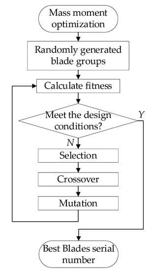 Li et al. used the ant colony algorithm to find the blade arrangement, and successfully reduced the impeller unbalance over one year to 1% of the standard value, and the impeller unbalance over 99% was reduced to 1% of the official value [,]. Mason used a neighborhood search algorithm to determine the best position of the turbine blades, so that the total time required for balancing could be significantly reduced. It also showed that using the starting points obtained from the Lagrangian dual scheme can greatly improve the results of the problem []. Thompson et al. used the simulated annealing algorithm to solve the large-scale combinatorial optimization problem of seeking the best layout through blade exchange [,,]. Dai et al. applied it to the optimal arrangement of blades of impeller machinery on the basis of the genetic algorithm, which solved the problem of a long solution time and an inability to obtain optimization results that were encountered in the previous optimization of a large number of blades by the exhaustive method [,,]. Pan et al. improved the genetic algorithm based on the genetic algorithm, and proposed an improved genetic algorithm to solve the assembly sort optimization problem [,,]. Wang improved the non-dominated sorting genetic algorithm (NSGA), introduced the control elite and dynamic crowding distance, and showed good performance when dealing with multi-objective optimization problems of wind turbines []. In this paper, we use a cloud adaptive genetic algorithm (CAGA) to solve the blade sorting problem for the rotor unbalance situation, and its convergence speed and sorting results are explained.