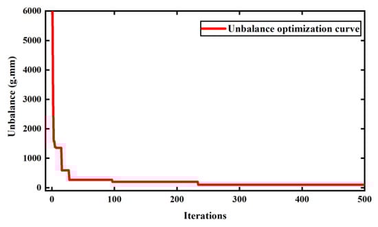 According to the mass moments given in Table 2, it was assumed that the disk unbalance is 0 g.mm. The cloud adaptive genetic algorithm was used to sort the blades. The set algorithm parameters were as follows: the population size N is 30; the maximum number of iterations is 500. The C sharp language was used to program the algorithm, and the algorithm was run on an ordinary PC with I7 2.4 GHz 4 GB running memory. It was found that the minimum unbalance of the population obtained varies with the number of iterations as shown in Figure 9.