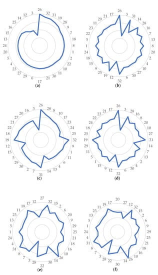 In order to compare the optimization effect of the cloud adaptive genetic algorithm, the blades were sorted according to several methods (weight sorted, sorting type 2, sorting-1/4 skip) mentioned in the paper [], and the obtained unbalance sorting results are shown in Figure 10a–c. According to sorting type 2, this paper designed sorting type 4, that is, sorting type 2 was used to re-distribute the blades in four sectors, and the resulting unbalance sorting result is shown in Figure 10d. The unbalance sorting results obtained by the genetic algorithm (GA) and cloud adaptive genetic algorithm (CAGA) are shown in Figure 10e,f.