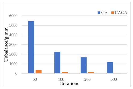 It can be seen from Table 4 that the weight sorted method causes the largest unbalance in the assembly process. The sorting type 2, sorting type 4, and sorting-1/4 skip method reduce the unbalance after arrangement to a certain extent relative to the weight sorted. GA also optimized the unbalance to a certain extent, but it still cannot meet the requirement that the unbalance cannot be brought into the tolerance range from the process, and the mass of the corresponding mass that needs to be balanced does not meet the requirements. From the perspective of the balance method, the intelligent algorithm optimization effect is better than the empirical method. The unbalance of GA is at least 57.5% optimized relative to the first four methods, and the unbalance of the CAGA algorithm is optimized by 95.7% relative to GA.