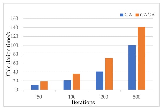Figure 11 shows that CAGA is much better than GA in terms of the algorithm accuracy, and the imbalance of the two methods decreases with the increase of the number of times. Figure 12 illustrates that CAGA is slower than GA in terms of the calculation time.