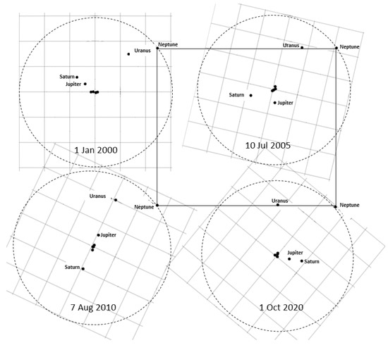 Orrery of the planets calculated using the website https://in-the-sky.org/solarsystem.ph (accessed on 15 July 2018) of Ford [3] from the reference date 1 January 2000, and forward, as labeled. Neptune is shown at a fixed position and Neptune’s orbit is approximated as a circle. Uranus has been pulling Neptune forward after ~1990, but the converse holds from ~1840 to ~1990, i.e., over most of the time since Neptune’s discovery. Permissions to include this figure were granted by Dominic Ford, who holds the copyright for the orrery of [3].