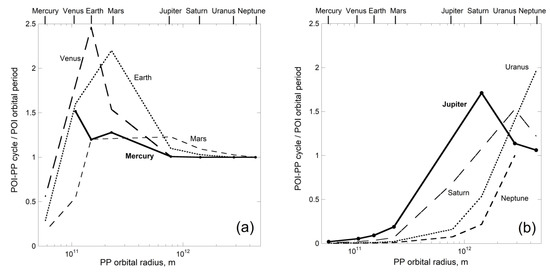 Ratio of the interaction cycles to the orbital period of the planet of interest (POI): (a) Rocky planets as POIs, showing strongly periodic interactions with neighboring perturbing planets (PP); (b) Giant planets as POIs, showing that the cycling is similar to that of the rocky planets. Data from Table 1 and NASA [15].