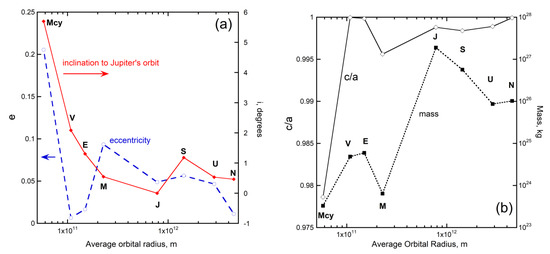 Physical parameters of the planets. Data from NASA [15]. The orbits are quite circular and nearly in the same plane, except for Mercury (Mcy): (a) Eccentricity and inclination relative to Jupiter’s orbit; (b) Axial ratio and mass.