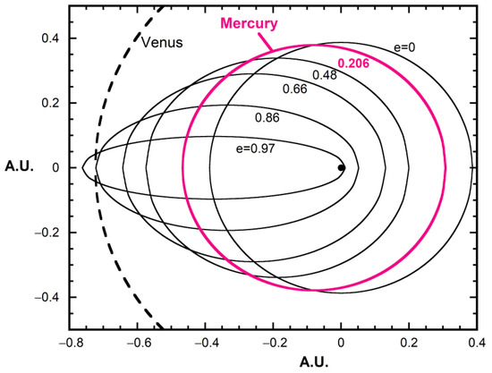 Figure 4. Family of elliptical orbits (light ellipses) with the same total energy of Mercury’s current orbit (shown in bold). Dashed curve = the circular orbit of Venus. Eccentricity as labeled. The semi-major axis of Mercury is unchanged when energy is conserved. After Hofmeister and Criss [22] (their Figure 3), which is reproducible under a Creative Commons Attribution 3.0 License. - Inclinations changing do not affect angular momentum magnitude or energy as this parameter does not enter into the equations for the orbits (Section 2.1). Additionally, any inclination is permitted about the Sun in the Keplerian formulation.