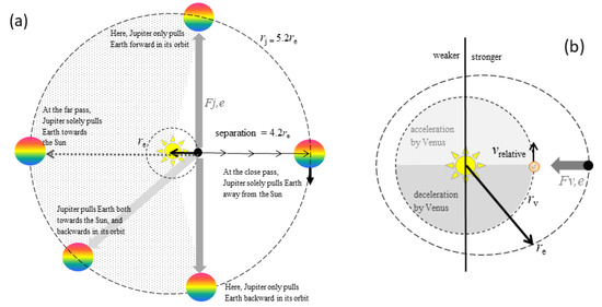 Schematics of the cyclical effects of nearby planets on Earth: (a) Effect of the directional changes of outboard PP Jupiter’s pull. Their orbits are approximated as circles of 1 and 5.2 units (dashed curves). In the reference frame of a stationary Earth (black dot), Jupiter (striped oblate) moves retrograde (heavy black arrow). The perturbing acceleration of Earth towards the Sun and along its orbit varies in magnitude and direction over the circuit, as shown by the five placements of Jupiter. The pull to Jupiter is strongest at the closest approach where d = 4.2 re and opposes the solar pull (thin black arrows). The wide dark grey arrow shows where pull towards Jupiter is perpendicular to the Solar pull on Earth. Inside the stippled sector, the force vector between Earth and Jupiter (light grey arrow) has a component towards the Sun, but the distance between Jupiter and the Earth is greater, reaching d = 6.2 re, so the pull of Jupiter is weaker. Because this sector is only slightly larger, and the force is inverse with distance squared, the net effect of Jupiter over the circuit is to oppose the pull of the Sun. The accelerations of Earth in its orbit are positive in the part of the diagram above the thin arrows, and negative below; (b) Effect of inboard PP Venus (speckled dot, whose orbit is almost circular) in Earth’s stationary frame of reference. In the instant following the close approach (shown here at Earth’s perigee) up until the far approach is reached, Venus pulls Earth in the prograde direction (advances Earth along Earth’s orbit). However, in the instant following the far approach, Venus is retarding Earth’s forward progress. For Venus’ nearly circular orbit, the pulls in the light grey half-circle balance those in the medium grey half-circle (except exactly on their border). Because torque does not exist at the two special points of the close and far approaches, Venus pulls Earth inwards without changing angular momentum over the cycle.