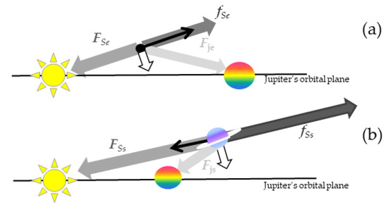 Schematics of out-of-plane perturbations, with reference to the orbital plane of massive Jupiter (large oblate). The ringed planet portrays Saturn. Not to scale. Dark and medium grey arrows indicate that the gravitational and centrifugal forces from the Sun are nearly equal. Light grey arrows depict the pull to Jupiter. White arrow = the component of Jupiter’s pull perpendicular to the orbit of the POI. Black arrow = the radial component of Jupiter’s action: (a) Action on the inner planets when close to Jupiter; (b) Action on planets outboard of Jupiter, when close. In diverse configurations, Jupiter pulls (torques) any given POI towards Jupiter’s orbital plan.