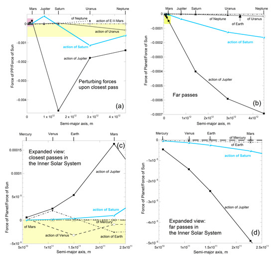Comparison of forces from various PP normalized to the Solar force on a POI. Positive ratios indicate that the PP is pulling the POI (labels on upper axes) outwards from the Sun, as calculated using data from NASA [15]. Far passes always pull inwards but with weaker forces than the close passes. PP symbols are as follows: Black square = Jupiter. Blue half-filled square = Saturn. Open square = Uranus. Triangle = Neptune. + = Mars. Dot = Earth. Circle = Venus. X = Mercury: (a) Force ratios during the closest pass. The yellow rectangle has the same size as part b and the pink rectangle has the same size as part c; (b) Force ratio during the furthest pass. The green rectangle has the same size as part d; (c) Force ratios during the closest pass for the rocky planets. Force ratios for Uranus and Neptune are smaller than −4 × 10−7, which is an order of magnitude smaller than the drag of Mars on Mercury, Venus, and Earth. The yellow rectangle is the same size as part d; (d) Force ratios during the most distant pass for the rocky planets. Neptune (not shown) has a force ratio less than that of Uranus.