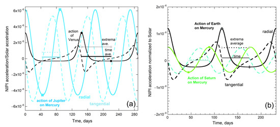 Calculated accelerations of Mercury both along and perpendicular to its orbit become more symmetrical as the distance of the PP from the POI increases: compare Figure 8b for the effects of Earth and Saturn to Figure 8a for the effects of Venus and Jupiter, respectively. Amplitudes decrease in agreement with Equation (5). The increasing symmetry with distance moves both extrema averages and averages with time towards zero. Weak actions of low mass Mars, or distant Neptune and Uranus, on Mercury (Figure 7) can therefore be neglected.