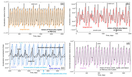 Sums of the accelerations (relative to Solar) on Mercury shown in Figure 8: (a) The two strongest PPs over one pseudo-cycle. After 2603 days, the peaks are nearly synchronized, but an exact match required 8529.3 days = 23.35 years. The dominating influence of Jupiter’s 88-day cycle is evident, while the excursions in the accelerations associated with the sum are greater than that of either component; (b) The two remaining important PPs. The pseudo-cycle of 1507 days is evident in the repeating pattern; (c) The sum of the close rocky planets compared to the sum of the distant massive gas giants. Clearly, the sum of any two perturbing planets provides a unique beat pattern; (d) The sum of the four strongest NIPI interactions, over 5 Earth-years. Neither the tangential nor the radial accelerations return to their starting configurations, and so the “average” over this terrestrially based period does not accurately describe the motions of Mercury.