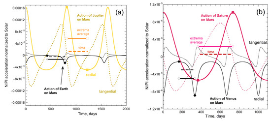 Numerical calculations, assuming circular orbits, of the actions on Mars (relative to the Sun’s acceleration): (a) Action of Jupiter (gold hues, 816.4-day cycle) and Earth (black, 779.9-day cycle); (b) Action of Saturn (pink hues, 733.8-day cycle) and Venus (black, 333.9-day cycle).