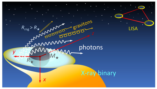 Figure 1. An illustration of the key physical and geometrical features of an astronomical configuration for the gravitational bremsstrahlung of light involving an X-ray binary and a possible detection concept with LISA. Here the mass of the compact object is assumed to be dominant for simplicity.