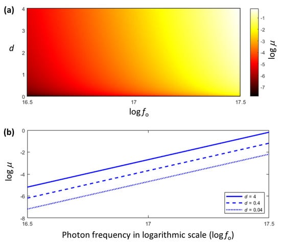Figure 2. The fractional energy loss μ given by Equation (71) as a function of the photon frequency f (Hz) in logarithmic scale along the horizontal axis evaluated with a chosen range of the effective gravity range parameter d = ( R rng R ) / R for the X-ray binary Cygnus X-1. Above, log μ is plotted in (a) as a projected height onto the ( log f , d ) plane and in (b) as a line for three representative values of d. It is obvious that as the photon frequency f increases from the optical spectrum, the photon-to-graviton energy conversion “chips in” at around f = 3 × 10 17 Hz at the start of the soft X-ray spectrum, so that μ 0.01 for d = 4 corresponding to R rng 100 R . Although here μ appears to carry on increasing with f , the validity of Equation (71) is strictly limited to small μ due to the Born approximation with weak interactions we have assumed in Equation (21) used to derive μ in Equation (71). Nonetheless, the ascending trend of μ with the photon frequency f suggests that starting from the soft X-ray frequencies, the gravitational bremsstrahlung of light in the vicinity of Cygnus X-1 may be important.