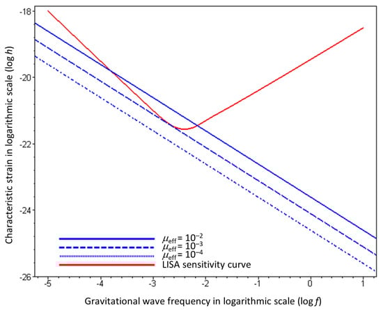 Figure 3. Estimated characteristic strain h of the gravitational waves with effective photon-to-graviton energy transfer rate μ eff for Cygnus X-1 with 0.01 % μ eff 1 % against the gravitational wave frequency f in Hz compared with the LISA characteristic strain sensitivity curve [37].