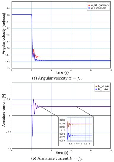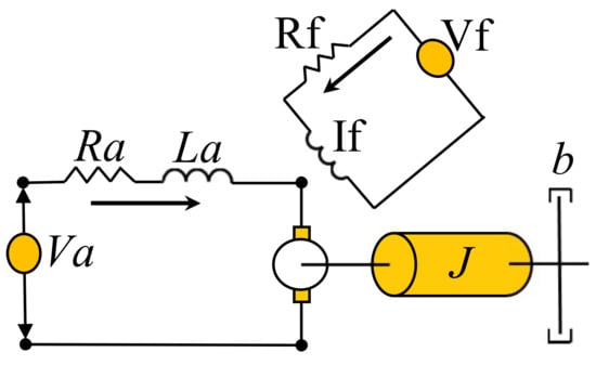 A nonlinear DC motor schematic model is shown in Figure 6. This system is a electromechanical model formed by the armature winding with resistance, inductance and voltage, namely , and , respectively; and the field winding with resistance, inductance and voltage, and , respectively; the inertia moment J and friction coefficient b represent the mechanical part of the system.