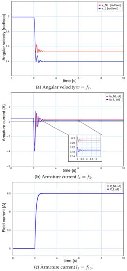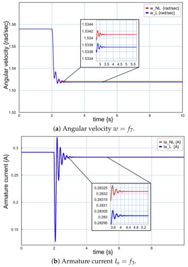 Figure 10 illustrates the responses with a single linearized model with the field winding voltage changed from V to V and when the neighborhood is V. In this case, we have a single linearization stage with a neighborhood of the size of the voltage change . We do not have a good approximation of the angular velocity and the armature current of the nonlinear and linearized models. The field current is the same in the nonlinear and linearized models.