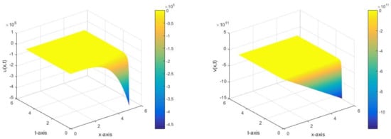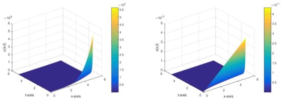 Thus, the coefficients () and () can be calculated for Equation (44) as arbitrary constants. This shows that there are power series solutions to the Equations (29) and (30). We then acquire the explicit power series solutions of Equation (1) (Figure 1 and Figure 2) as