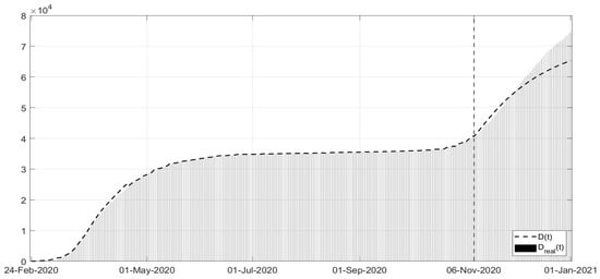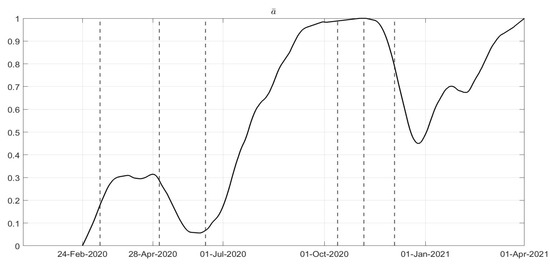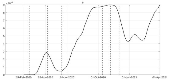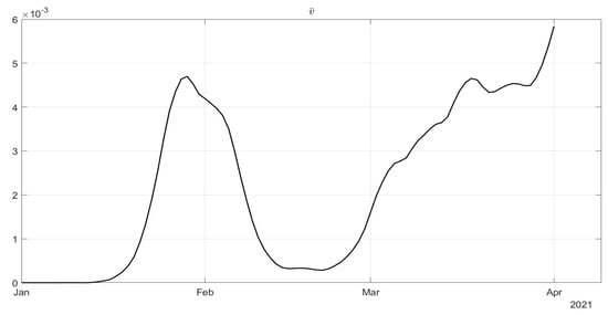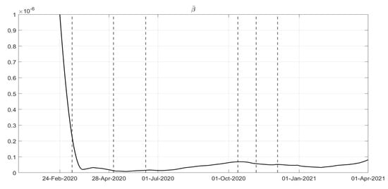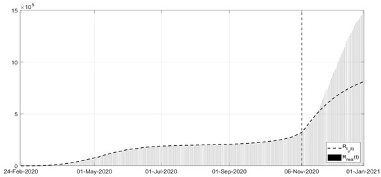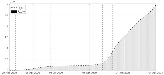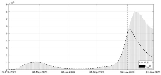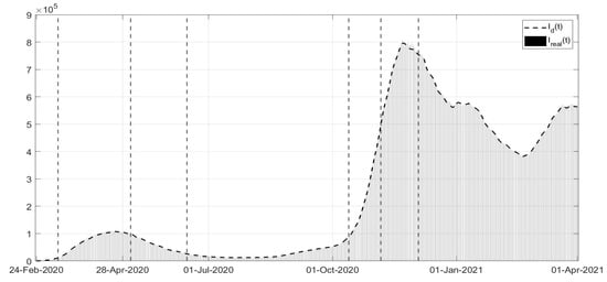 where parameter is related to the rate of healing for infected patients. This implies that a simplified choice for the cost index (34) can be assumed, leading to the identification of , , up to the end of December 2020, with the addition of starting from January 2021.