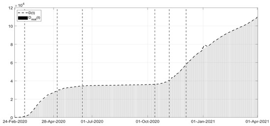 The identification of the model is therefore influenced by these actions, the consequences of the governments’ choices and of personal behaviours; as previously mentioned, the strict lockdown is the most effective action to contain the spread. Nevertheless, it cannot be the solution for long periods, for both social and economic reasons; therefore, there have been attempts to propose proper and balanced containment measures, depending on the evolution of the pandemic [22]. It is worth noting that awareness of the impact of the containment measures can also modify people’s behaviours and therefore the trend of pandemic itself.