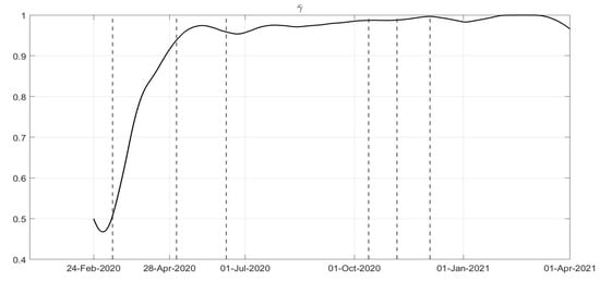 The approach adopted in this paper was to consider the model evolution influenced by the application of the containment measures since the very beginning of the analysis; this is reasonable as the data only started to be collected at the end of February 2020 with the introduction of measures of increasing severity [1]. All the actions , , are assumed between 0 and 1. Note that for the controls, the value 0 corresponds to the absence of any action, whereas 1 represents the maximum effort. The controls are multiplied by factors representing the effectiveness of the control; therefore, the identification of the containment measures is obtained once the evolutions of the quantities , , , , and are determined. Note that the meaning of the evolution of is opposite with respect to the corresponding one of : when the control is maximum (ideally equal to 1), the quantity has its minimum value (corresponding to the absence of contacts); similar consideration holds for the control and the quantity .